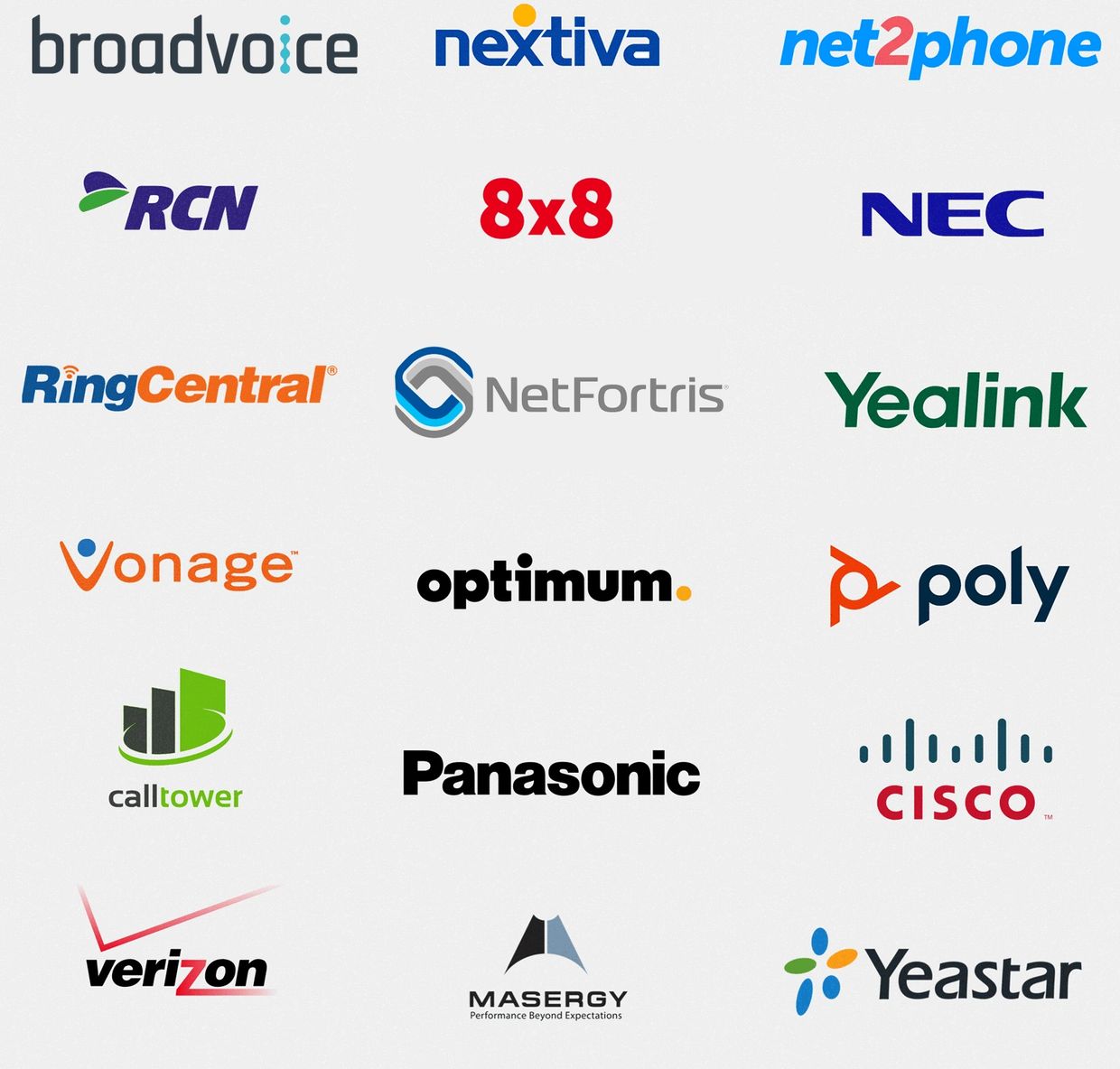NEC, 3CX , Windstream , Time Warner Cable, RingCentral , RCN, Vonage, Panasonic, Sotel System, Net2Phone, Optimum, Cisco, Verizon, Polycom, Yearlink, Masergy, Yeastar and IDT